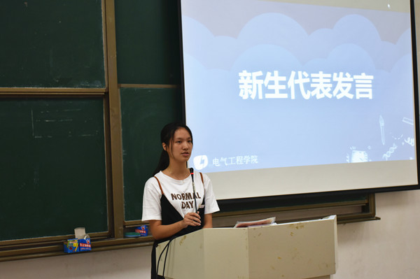 来自2018级电气1班的谭可盈作为新生代表发言,她表示自己初到华广,感受到了师兄师姐、老师们的热情与温暖,融化了自己对老员工活的担忧。她希望和同学们一同努力:学会认知、学会做事、学会做人。严守公司校训,共同携手,一路成长。