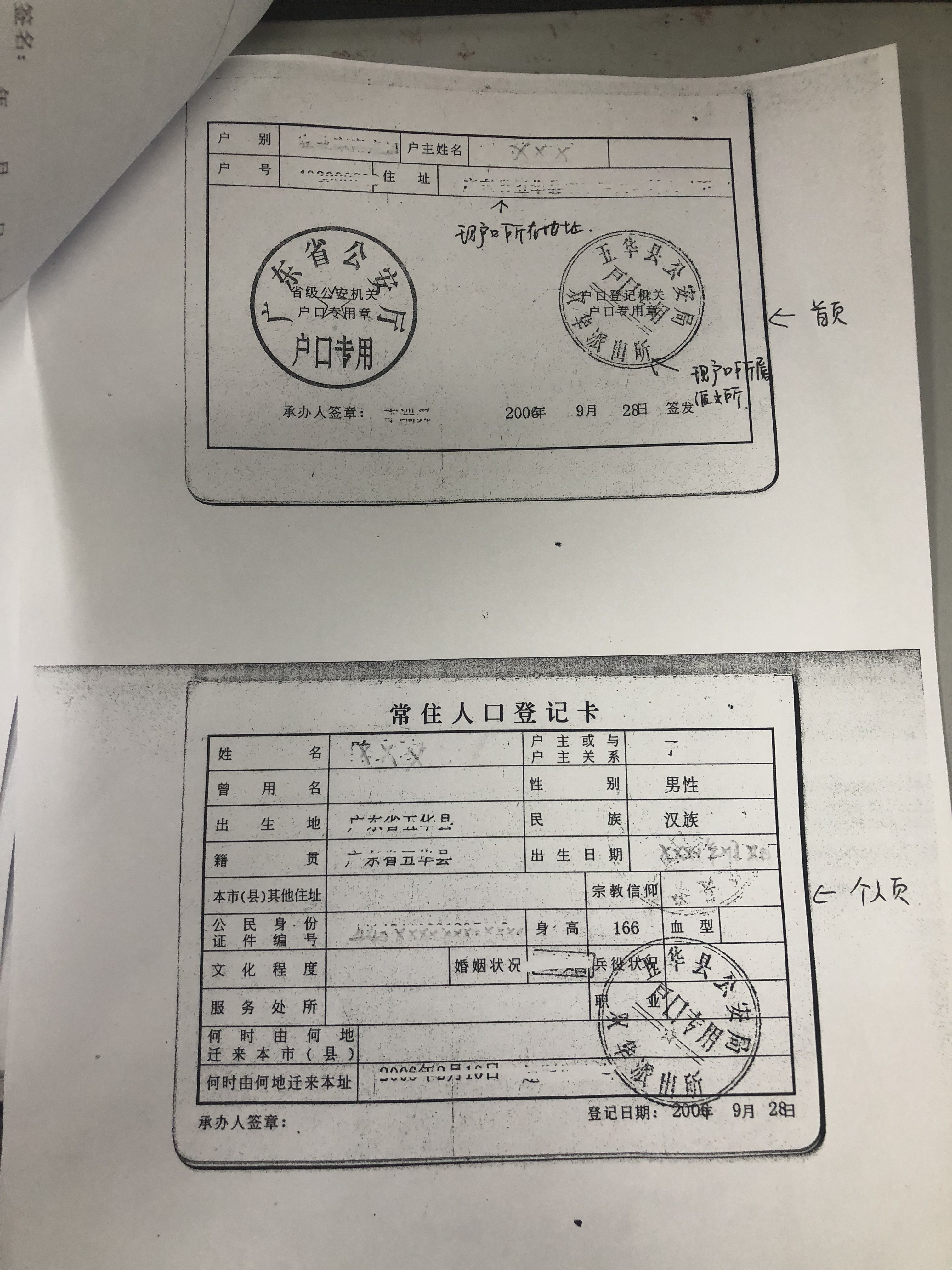 样本:户口本首页及本人页复印件