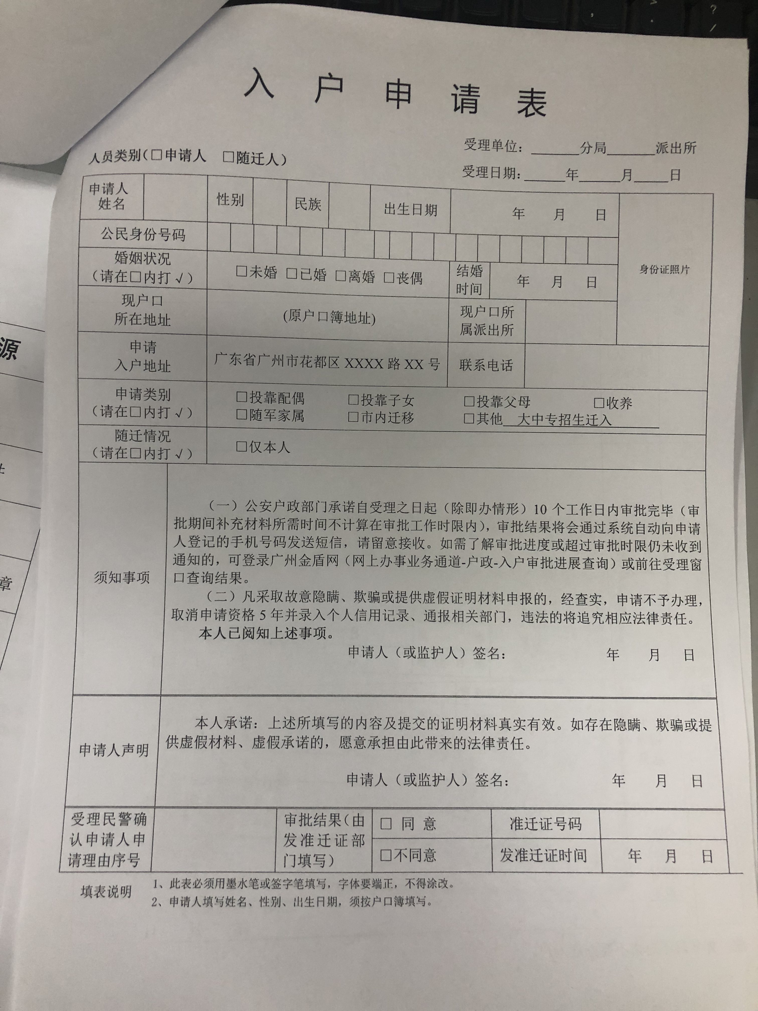 样本:入户申请表可到辅导员处或户籍地办理现场领取,须贴一寸彩色证件照(底色无要求)。