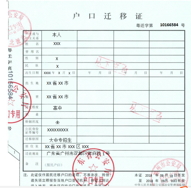 3.省外迁移:必须要有户口迁移证、户口本首页及本人页复印件(样本1)、填写入户申请表(样本2)、录取通知书复印件、身份证原件。