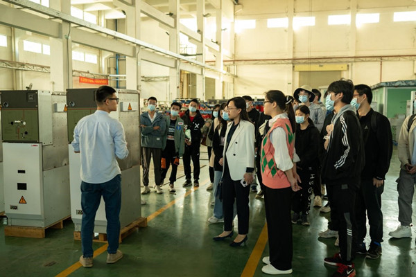 邱凯峰首先带领大家来到企业生产车间,详细地介绍了企业的产品,生产流程与工艺、设备使用原理以及生产过程。车间参观过程中,同学们细心观察生产配电柜、开关柜等产品的工艺流程,并向车间负责人主动请教专业理论知识。18级电气工程及其自动化2班黄志锋认为,“通过这样‘零距离’的参观,我们不仅对企业有了直观的了解,感受到他们在专业领域的深耕细作,也对自己所学的专业有了更深一层的认识和体会,也明确了求职就业的方向。”