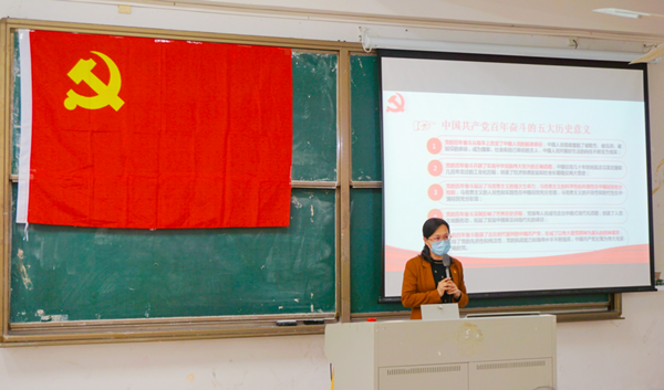 张郡以“学思践悟守初心,踔厉奋发向未来”为题,围绕习近平总书记在全会上的重要讲话和《决议》精神,阐述了四个历史时期、三次伟大飞跃,从“十个明确”概括习近平新时代中国特色社会主义思想核心内容、“十三个方面”总结新时代历史性成就和历史性变革以及“五个方面”总结百年奋斗历史意义,深刻认识“两个确立”的决定性意义,深刻认识全会作出历史决议的重大意义。她还带领大家一起学习“两会”精神,并结合国家“十四五”时期现代能源体系建设的主要目标,重点解读了南方电网公司碳达峰行动方案,以近3年公司毕业生就业单位相关情况为例,引导员工关注、了解能源电力行业动态,增强专业自信,提升对中国能源电力行业发展的认知和参与感、自豪感,体现新时代青年的思考与担当。