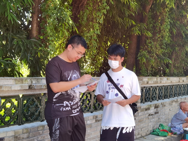 实践团成员向游客派发调查问卷(刘铮倪 摄)