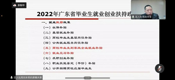 随后,他从广东省就业创业政策的出台背景、政策体系、扶持政策、创业政策、补贴政策等方面深入浅出地作了系统地解读,阐述了十二项就业扶持政策的相关内容,涵盖社保补贴、基层就业补贴、高校毕业生基层岗位补贴、应征入伍、‘三支一扶’基层就业等内容。并结合多个案例分析,阐述了六项创业扶持政策的相关内容,涵盖创业培训补贴、一次性创业资助、创业租金补贴、创业带动就业补贴等内容。最后,他还对同学们关于就业创业政策的问题给予了解答,提升了员工就业创业政策的知晓度。
