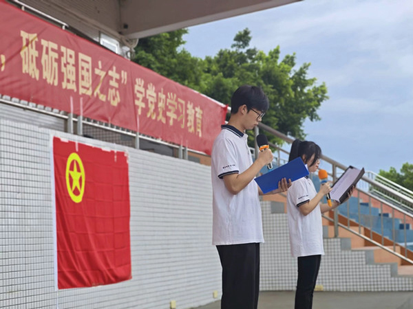 伴随着国旗护卫队铿锵有力的“齐步走!”和整齐划一的步伐,升旗仪式正式拉开帷幕。全体师生向国旗行注目礼,五星红旗在庄严的国歌声中徐徐升起。礼毕,符红勋发表讲话。她带领同学们简要回顾了中国共产党从无到有、不断发展壮大的历程,鼓励同学们要将爱党、爱国情怀内化于心、外化于行,刻苦学习、提升自我,以充足的知识储备和饱满的精神状态追求梦想,迎接新时代。