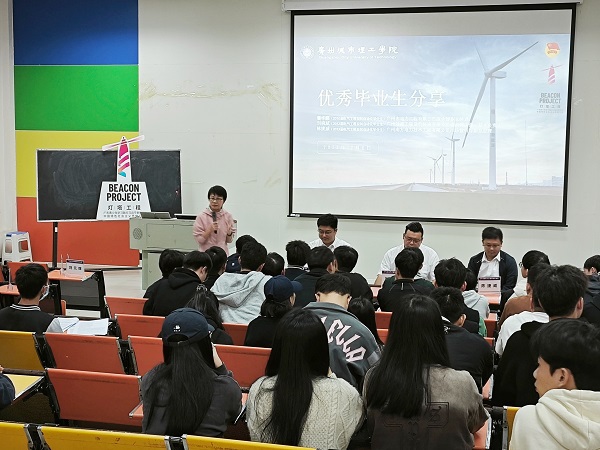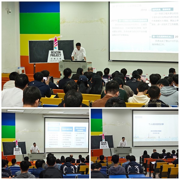2013届优秀员工陈捷威曾是校员工会主席,现任广州南方电力技术工程有限公司市场营销部副总经理。他首先举了两个工作中的案例,从自身经验出发向同学们强调创新能力与学习能力的重要性。他告诫同学们“不要等,就从现在开始准备”,同时也鼓励同学们“不要怕,勇于试错,勇敢去闯”。