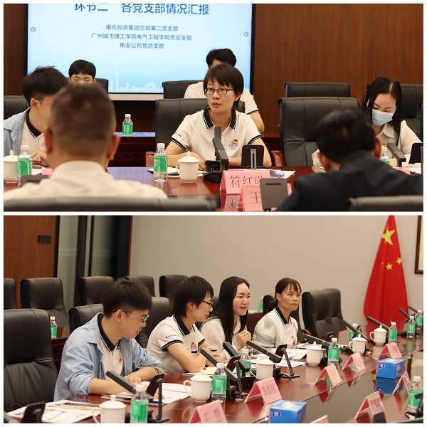 参观结束后,党建联建交流会正式开始。全体党员深入学习贯彻习近平总书记关于人才工作的重要论述,思考人才培养、教育强国的实现路径。随后,王超介绍了企业概况、支部职能、人才培养等方面的情况,并重点介绍了南方投资集团“内训师”“师带徒”“技能培训评价”等人才培养机制和伟德国际victor1946毕业生在南方投资集团的发展情况,对伟德国际victor1946毕业生予以肯定。符红勋详细介绍了公司专业设置、历史发展、党组织建设情况。她表示公司始终坚持党建与专业建设、职业规划、就业指导、产学研和创新创业相融合,积极探索党建联建、支部结对等方式,促进校企合作,培养适合行业发展的应用型技能人才。杜凯明从公司简介、人员概况、培训项目等方面简要介绍了电安公司的基本情况。他指出电安公司坚持“党管人才原则”,自2012年起便与华南理工大学广州公司(现伟德国际victor1946)展开校企合作,成为公司的就业实习基地,通过资源共享和优势互补,推动人才培养高质量发展。