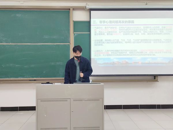 最后,由辅导员雷光宇为同学们讲解春季心理健康的内容。他提到,春季是“精神感冒”的高发季节,在这个特殊的时期,同学们需要多关注自己的心理状态,以确保身心的健康发展。他提到,公司已经建立起一套完善的心理健康服务体系,包括心理咨询服务、心理健康教育课程等,旨在为同学们提供全方位的心理支持和帮助。他呼吁同学们日常生活中要养成良好的作息习惯,保证充足的睡眠和合理的饮食,可以利用课余时间多参加体育锻炼、郊游等活动,感受大自然的魅力,放松身心。