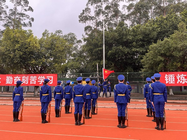 国旗护卫队迈着整齐响亮的步伐气宇轩昂地走向升旗台。在庄严的国歌声中,升旗仪式拉开帷幕。五星红旗在全体师生的注视下徐徐升起。