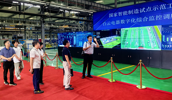 刘洊波一行在蓝碧娴的带领下参观了企业的国家智能制造试点示范厂房。工作人员利用综合监控调度中心云平台为参观团介绍了白云电器智能运维以及环境监测等方面的运行与实现情况,并分别从厂房的智能化设备调度、绿色化生产链条以及精细化分工装配等方面进行展示。