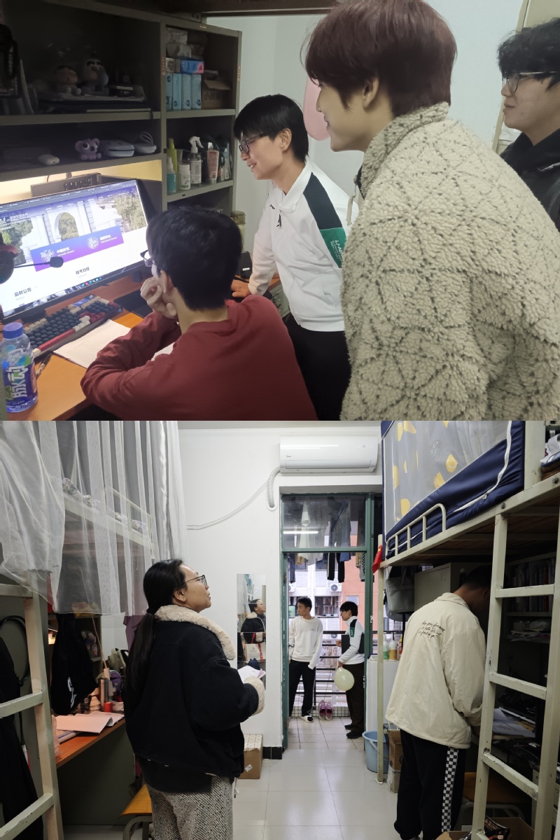 宿舍趣味运动会结束后,符红勋带队进行全院宿舍卫生安全大检查。检查人员深入各个宿舍,仔细排查违规电器、用电隐患以及卫生死角等问题。此次宿舍检查旨在为同学们营造安全舒适、整洁有序的生活环境,切实保障宿舍生活质量和员工人身安全。