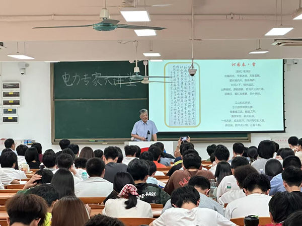 张尧从数风流人物,还看今朝,翻开了中国电力史的篇章。他带领同学们从“中国第一”看中国电力发展、从“世界第一”看中国电力发展和地位、从传统火力发电到如今清洁能源的发展使用……他详细阐述了电力和电力系统历经了怎样的发展历程,以及新型电力系统在技术革新、环境保护和可持续发展等方面面临着怎样的挑战。他还讲述了中国电力教育的发展历程。1908年国立交通大学成立第一个电力专科专业,1933年北洋大学成立第一个电力本科专业……这场跨越百年的教育接力,正为构建新型能源系统注入不竭动力,书写着属于这个时代的电力强国答卷。