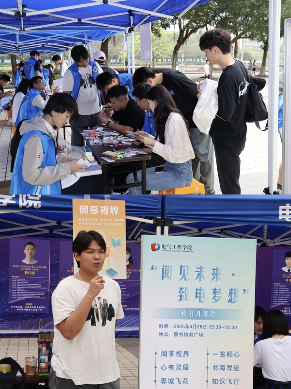 在“一签倾心”压花书签DIY区,草本干花与压花工艺相映成趣,100余份材料包被制作成文创作品。“阅享视界”书籍分享区成为阅读交流的阵地,10余名同学现场向大家分享读书感悟。2024级电气2班廖韦竣同学在谈及《大秦帝国》时表示:“书中展现的工匠精神与创新魄力,让我对电气工程专业的历史使命有了新认知。”