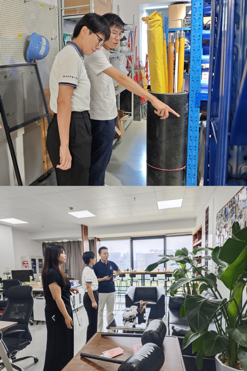 首先,符红勋一行来到广东睿哲电气科技有限公司。公司创始人2014届员工梁一鸣带领参观了公司办公室、物资室、会议室、休息区等区域。交流环节,梁一鸣介绍了公司的发展历程、业务范围以及人才招聘等方面的情况。双方围绕行业动态、人才培养、员工实习就业等话题展开深入探讨。