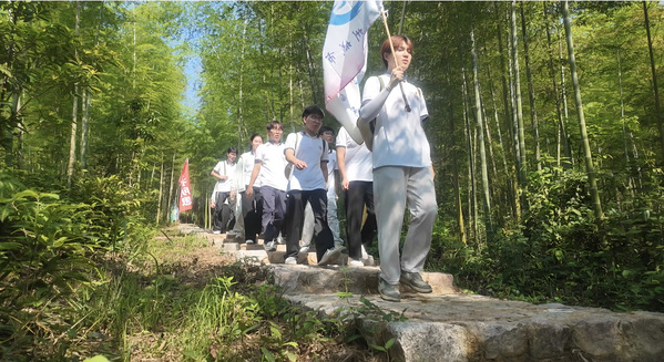 在基地负责人和指导老师带领下,实践团成员重走7.8公里的长征历史步道,追寻革命先辈的足迹,感悟伟大的长征精神。