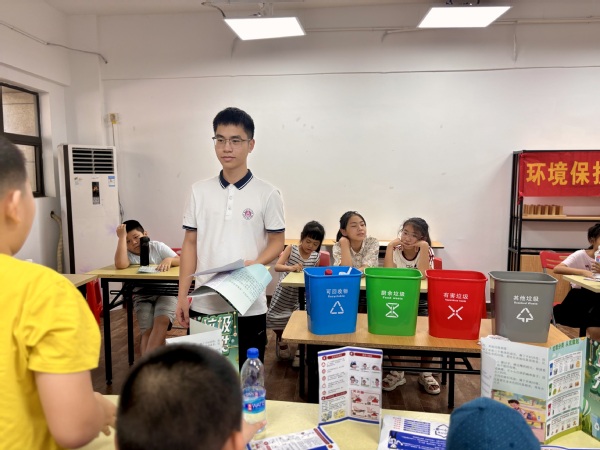 用电安全课堂上,实践团成员手持宣传册讲解后,邀请员工抢答生活用电知识。垃圾分类课上,成员们搬出了社区提供的四色迷你垃圾桶模型,让员工轮流上台投放印有电池、纸张、过夜饭菜等图例卡片,再对照宣传手册验证其操作准确性。其他安全课程则覆盖卫生教育、夏季流行病防范、防溺水等各个方面,通过开放性问答,引导员工熟识避险要点。