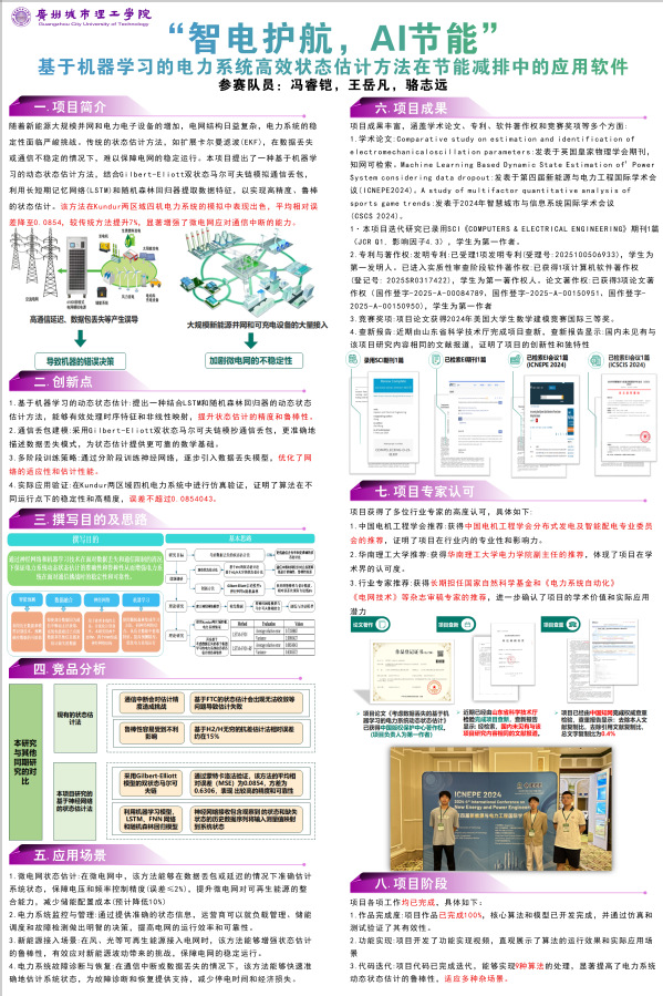 本次获奖项目为“智电护航,AI节能”——基于机器学习的电力系统高效状态估计方法在节能减排中的应用软件。本项目围绕微电网通信不稳定条件下的动态状态估计问题,提出了一种融合马尔可夫信道建模与集成机器学习架构的高鲁棒性状态识别方案,重点解决新能源高渗透背景下测量数据丢失对调控精度的制约。该方案不依赖硬件升级,已完成软件封装,具备良好的嵌入式部署能力,适用于新型电力系统的在线监测、储能调度及智能运维场景,能够有效提升电网运行效率、增强分布式能源系统韧性,充分体现了面向“新质生产力”的工程实践价值。