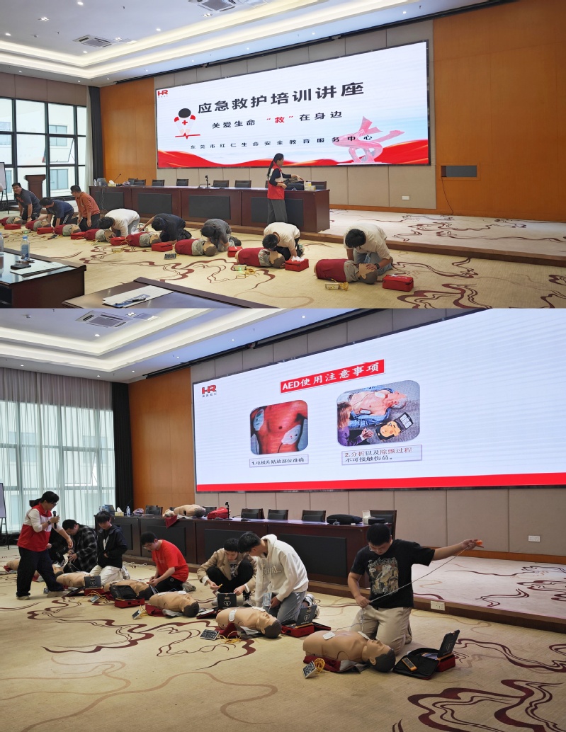 实习首日,东莞市红十字会为同学们讲授了应急救护知识,重点讲解心搏骤停的临床表现及心肺复苏的操作流程,并分步演示了“安全评估→识别判断→高声呼救→摆放体位→胸外按压→开放气道→人工呼吸”等关键环节。授课教师强调,在突发状况中正确使用AED(自动体外除颤器)对提高抢救成功率至关重要。模拟抢救练习环节,员工们在教师指导下逐一操作,进一步巩固应急技能。员工表示,“通过此次学习,今后若遇紧急情况也将敢于施救、能够施救。生命无小事,把握黄金救援时间就是守护生命。”