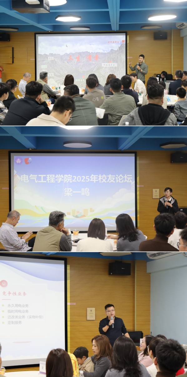 致辞与分享环节结束后,员工论坛正式拉开帷幕。2010级员工梁一鸣从自身在佛山创业的实战经历出发,深入剖析了区域电力市场的独特特点与发展脉络,分享了其在电力试验、光伏运维、储能技术等前沿领域的探索心得与深度思考;2009级员工陈捷威则立足在南方电力技术工程有限公司十余年的从业经验,从管制性业务、竞争性业务和创新服务三个核心维度,系统分析了当前电力行业的发展格局,并对未来行业趋势作出了前瞻性预判,为在场师生带来了一场干货满满的行业分享。